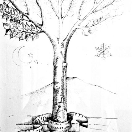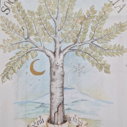 Alla radici del faggio si trovano le due date degli atti di fondazione, stipulati entrambi in una notte d’inverno simboleggiata dalla luna e dal fiocco di neve.