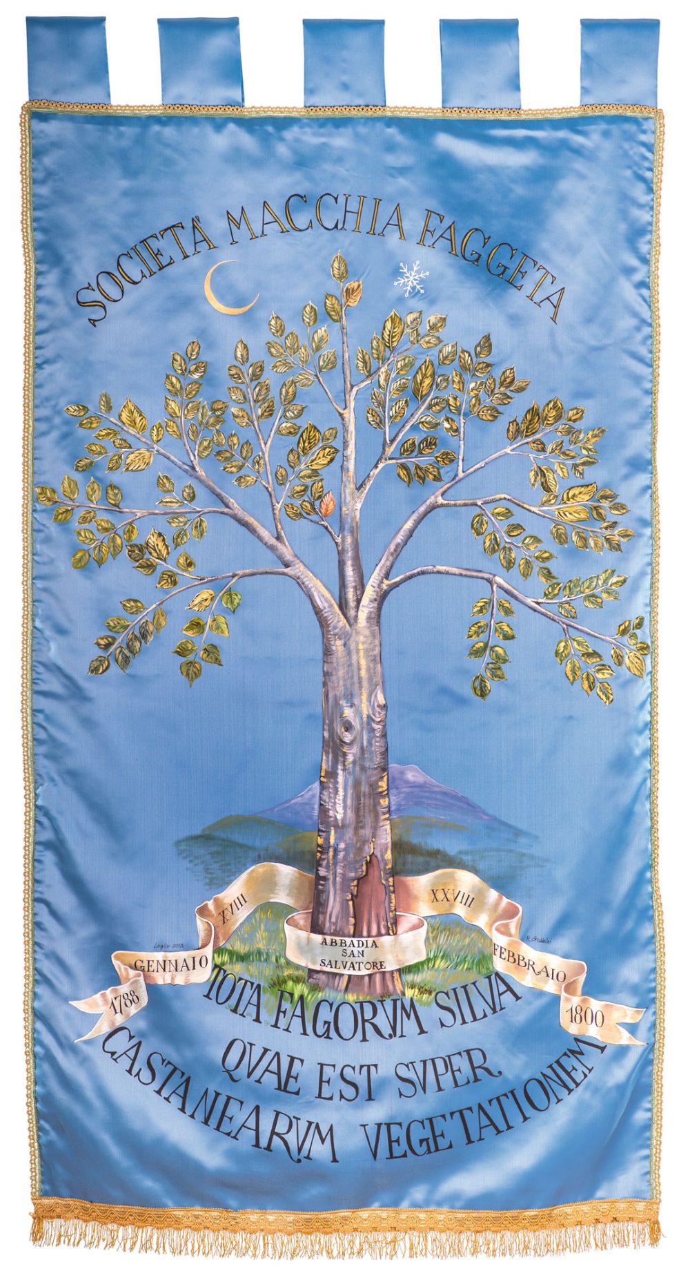 Lo stendardo della Società, realizzato dal Prof. Marco Giubbilei nel 2012, per espressa volontà del Presidente Sergio Nottolini, rappresenta la sintesi della nascita della Macchia Faggeta.
