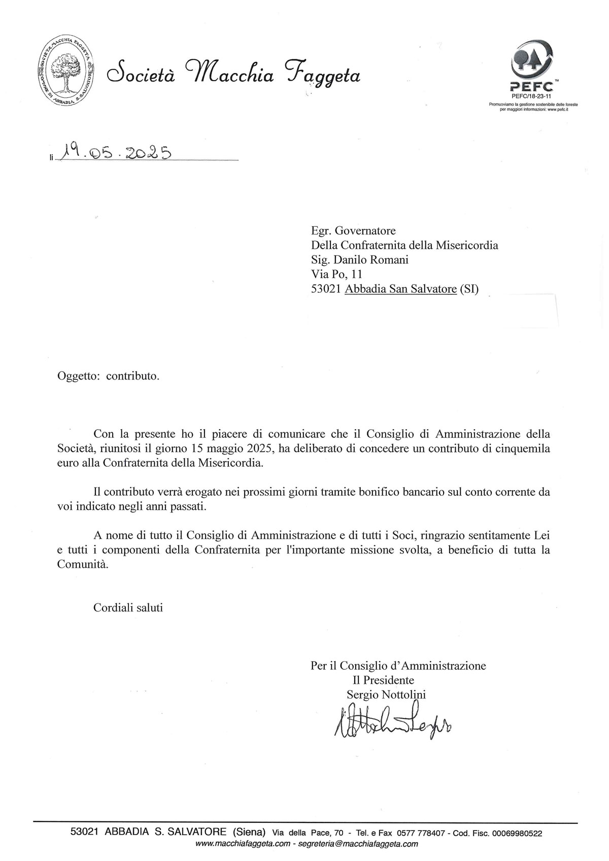Il Consiglio di Amministrazione della Società Macchia Faggeta nel mese di maggio ha deliberato l’erogazione, a nome di tutti i suoi soci, dei seguenti contributi a favore di associazioni/organizzazioni locali per supportare attività di utilità sociale, culturale e umanitaria.