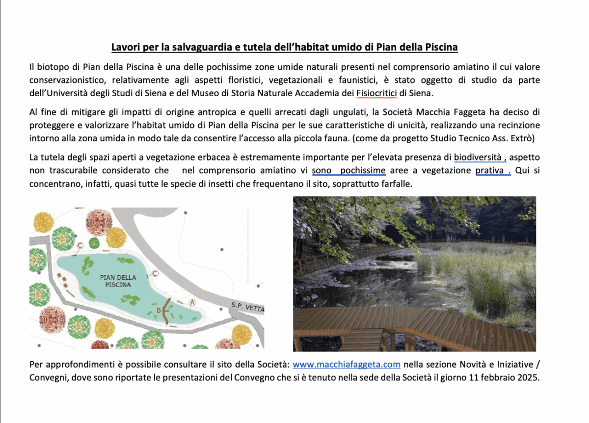 Al fine di mitigare gli impatti di origine antropica e quelli arrecati dagli ungulati, la Società Macchia Faggeta ha deciso di proteggere e valorizzare l’habitat umido di Pian della Piscina per le sue caratteristiche di unicità, realizzando una recinzione intorno alla zona umida in modo tale da consentire l’accesso alla piccola fauna. (come da progetto Studio Tecnico Ass. Extrò)